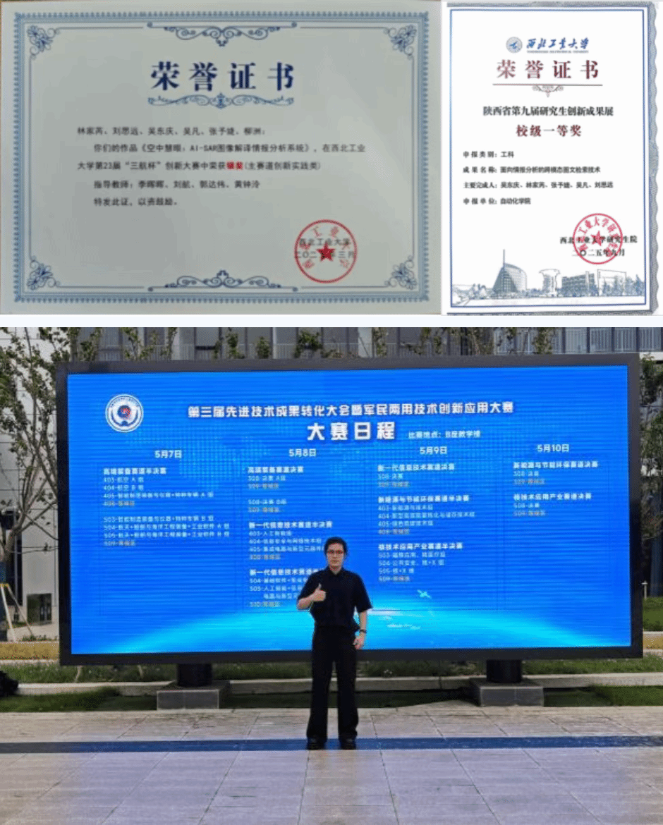 科创实践是对学术研究的有力延伸与检验。林家芮在深耕算法理论的同时,他积极推动科研成果从实验室走向工程应用。作为项目负责人,他带领团队在多项科创竞赛中不断突破:荣获西北工业大学第23届“三航杯”创新大赛主赛道银奖、陕西省第九届研究生创新成果展一等奖。
